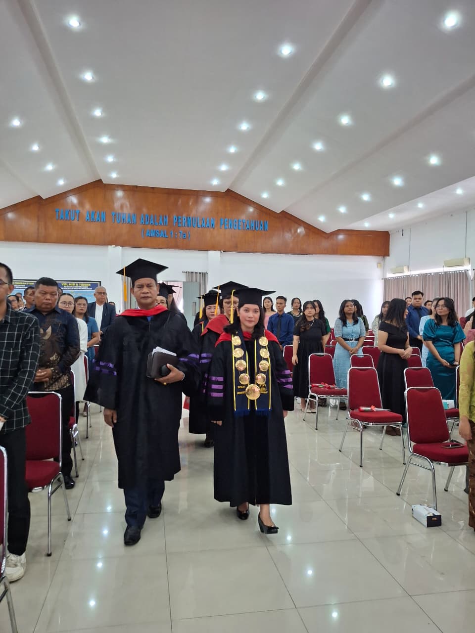 Memasuki inti acara, prosesi penyematan selempang dilakukan kepada seluruh calon wisudawan sebagai tanda pengukuhan mereka. Suasana haru semakin terasa ketika para lulusan membacakan Janji Alumni sebagai bentuk komitmen untuk menjunjung tinggi etika profesi psikologi dan menjaga nama baik almamater. Para wisudawan memberikan bunga kepada dosen sebagai simbol penghargaan dan rasa terima kasih atas bimbingan, perhatian, serta ketulusan mereka selama proses studi. Ungkapan kasih tersebut dibalas oleh para dosen yang mempersembahkan lagu “Anakkon Hi Do Hamoraon Di Au,” menciptakan suasana penuh kehangatan dan kedekatan emosional antara dosen dan mahasiswa.