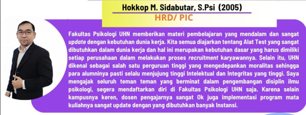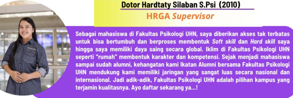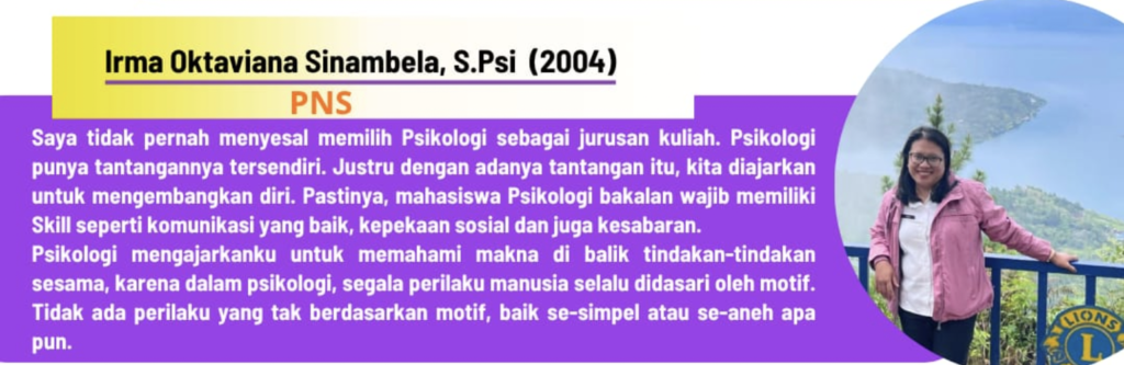 Sementara itu, Irma Oktaviana Sinambela, S.Psi (2004) yang kini bekerja sebagai PNS, menyampaikan bahwa ia tidak pernah menyesal memilih Psikologi sebagai jurusan kuliahnya. Menurut Irma, psikologi mengajarkan mahasiswa memahami perilaku manusia secara lebih mendalam, baik melalui teori maupun pengalaman praktis. Read More