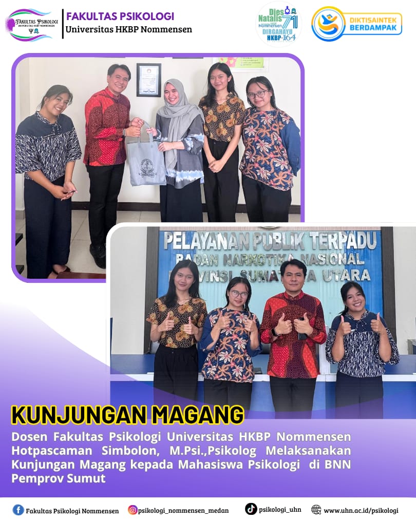 Medan, 19 November 2025 — Fakultas Psikologi Universitas HKBP Nommensen melaksanakan Kunjungan Magang ke beberapa instansi mitra sebagai bentuk komitmen dalam memastikan kualitas pembelajaran praktik mahasiswa. Kunjungan ini dilaksanakan oleh salah satu Dosen Fakultas Psikologi, Hotpascaman Simbolon, M.Psi., Psikolog, yang secara langsung meninjau perkembangan dan proses magang mahasiswa di berbagai tempat.