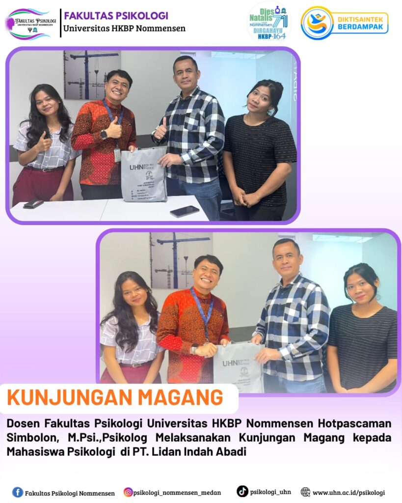 Kunjungan berikutnya dilaksanakan pada 6 November 2025 ke PT. Lidan Indah Abadi, yang saat ini menjadi lokasi magang bagi 2 orang mahasiswa Psikologi dalam bidang Psikologi Industri dan Organisasi. Mahasiswa terlibat dalam: Observasi perilaku kerja, administrasi dan dukungan aktivitas HR, pengembangan keterampilan psikologi terapan. Kunjungan ini turut memperkuat hubungan antara fakultas dan dunia industri. Fakultas Psikologi UHN berkomitmen untuk menjamin proses magang berjalan optimal, memberikan bimbingan akademik kepada mahasiswa, memperluas kerja sama dengan institusi pemerintah dan industry serta meningkatkan relevansi pengalaman praktik bagi mahasiswa. Kegiatan kunjungan magang ini diharapkan dapat berkelanjutan dalam mendukung peningkatan kualitas lulusan Psikologi UHN.