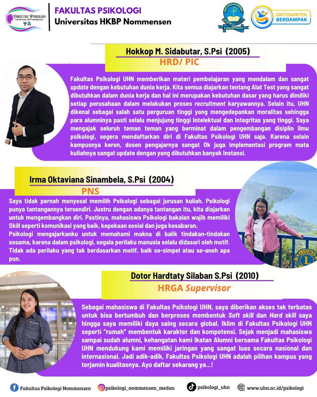 Salah satu alumni, Hokkop M. Sidabutar, S.Psi (2005) yang berkarier sebagai HRD/PIC, menuturkan bahwa pembelajaran di Psikologi UHN membekali dirinya dengan pemahaman mendalam mengenai proses recruitment dan penggunaan alat tes psikologi yang sangat dibutuhkan dalam dunia kerja. Menurutnya, materi yang diajarkan bersifat update dan relevan dengan kebutuhan perusahaan. Ia juga menegaskan bahwa UHN tidak hanya mengutamakan keterampilan teknis, tetapi juga membentuk moralitas dan integritas mahasiswa sehingga menjadi pribadi yang siap menghadapi tantangan kerja. Hokkop mendorong calon mahasiswa untuk tidak ragu memilih Psikologi UHN karena kualitas pengajaran dan program kampus yang benar-benar selaras dengan kebutuhan industri.