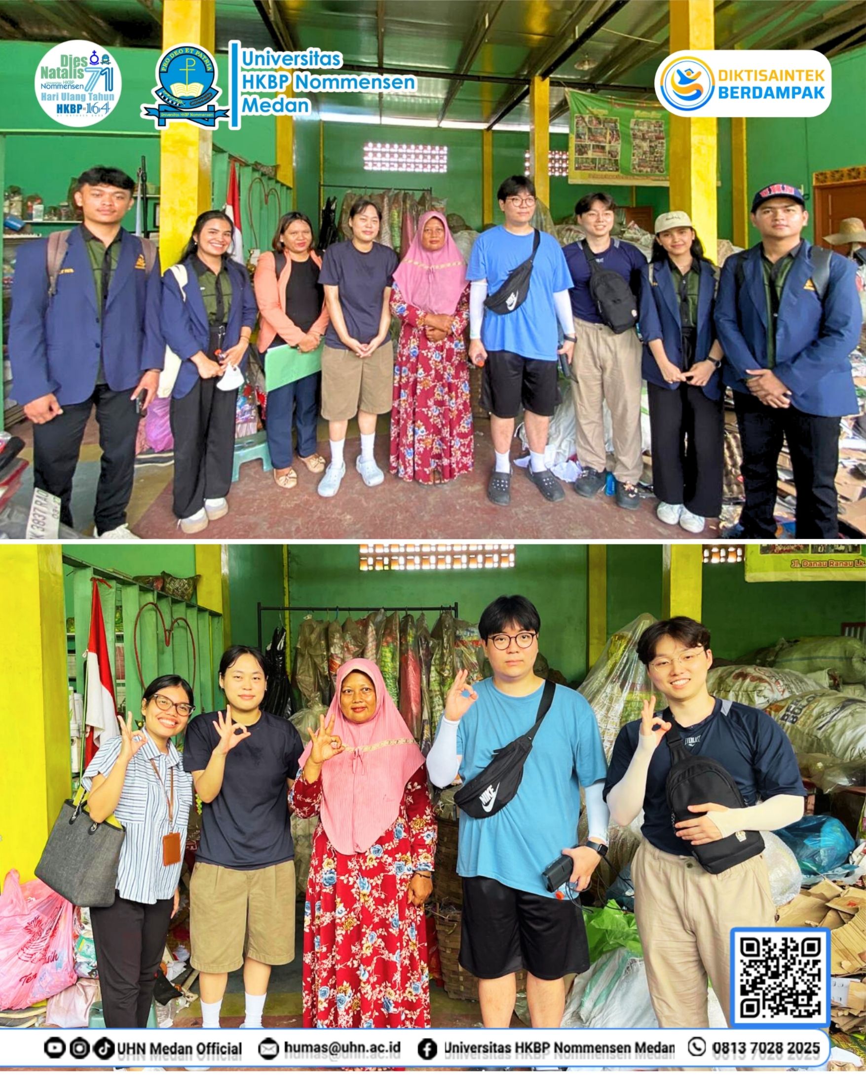 Pada Jumat, 10 Oktober 2025 beberapa mahasiswa dan dosen Universitas HKBP Nommensen Medan bersama dengan 4 mahasiswa dari Handong Global University, Korea Selatan, melaksanakan kegiatan kunjungan inspiratif ke Bank Sampah Induk Satu Hati Binjai. Kegiatan ini menjadi wadah pertukaran pengetahuan dan pengalaman mengenai pengelolaan sampah berkelanjutan, inovasi lingkungan, serta pemberdayaan masyarakat. Melalui kunjungan ini, para mahasiswa belajar langsung tentang pentingnya kolaborasi global dalam menjaga kelestarian bumi dan menciptakan perubahan positif bagi lingkungan. Semangat gotong royong dan kepedulian sosial yang ditunjukkan menjadi cerminan nyata dari nilai-nilai edukatif lintas budaya yang menginspirasi generasi muda.