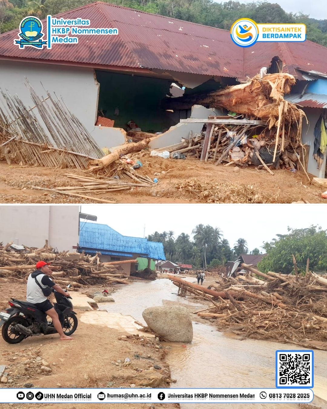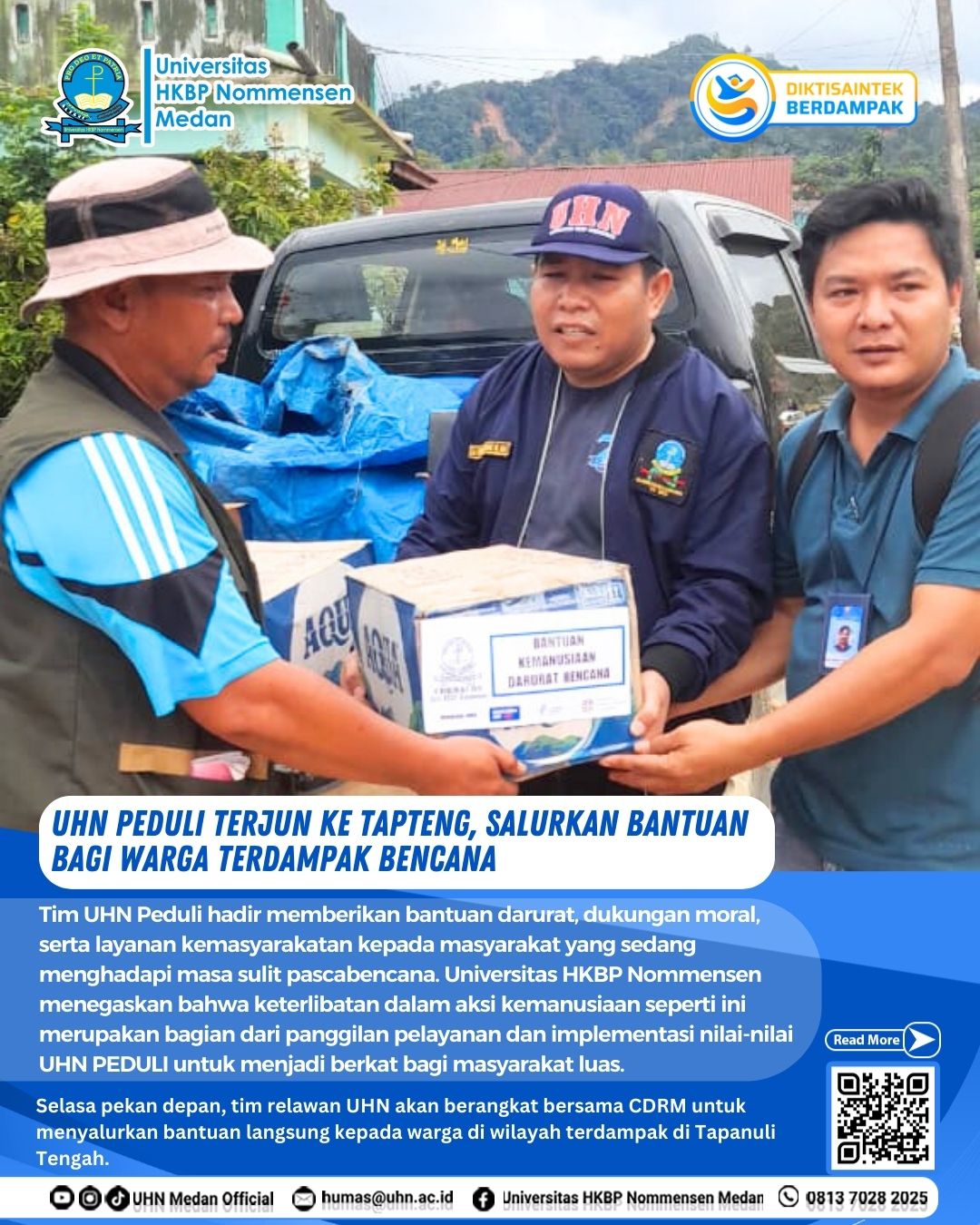 Universitas HKBP Nommensen (UHN) Medan melalui program UHN Peduli kembali menunjukkan komitmennya dalam aksi kemanusiaan dengan turun langsung membantu warga terdampak bencana di Kabupaten Tapanuli Tengah (Tapteng), pada Jumat 5 Desember 2025. Tim UHN Peduli hadir memberikan bantuan darurat, dukungan moral, serta layanan kemasyarakatan kepada masyarakat yang sedang menghadapi masa sulit pascabencana.